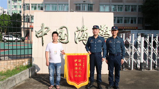 圖為獲救船員代表送上錦旗。