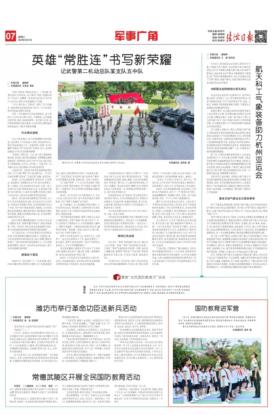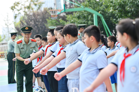 9月11日,武警安徽總隊合肥支隊聯(lián)合駐地學校開展“踔厲奮發(fā)強國防 勇毅前行向復興”為主題的全民國防教育進軍營活動,通過普及國防知識、參觀武器裝備、學做軍事動作等,增強學生國防意識。