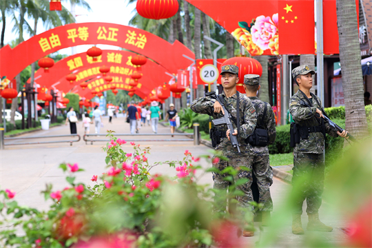 圖為擔(dān)負(fù)巡邏任務(wù)的武警海南總隊(duì)官兵在??诮鹋X公園巡邏執(zhí)勤。