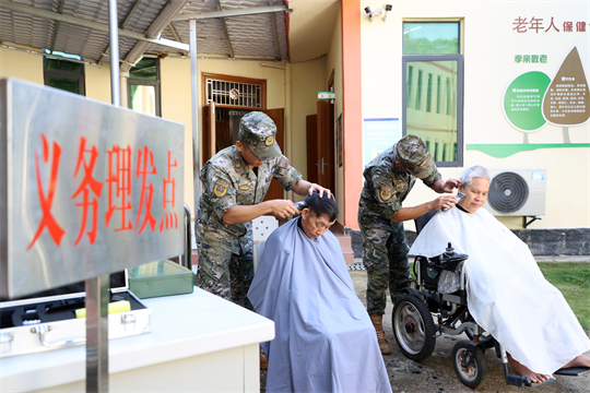 圖為武警官兵為敬老院老人義務(wù)理發(fā)。