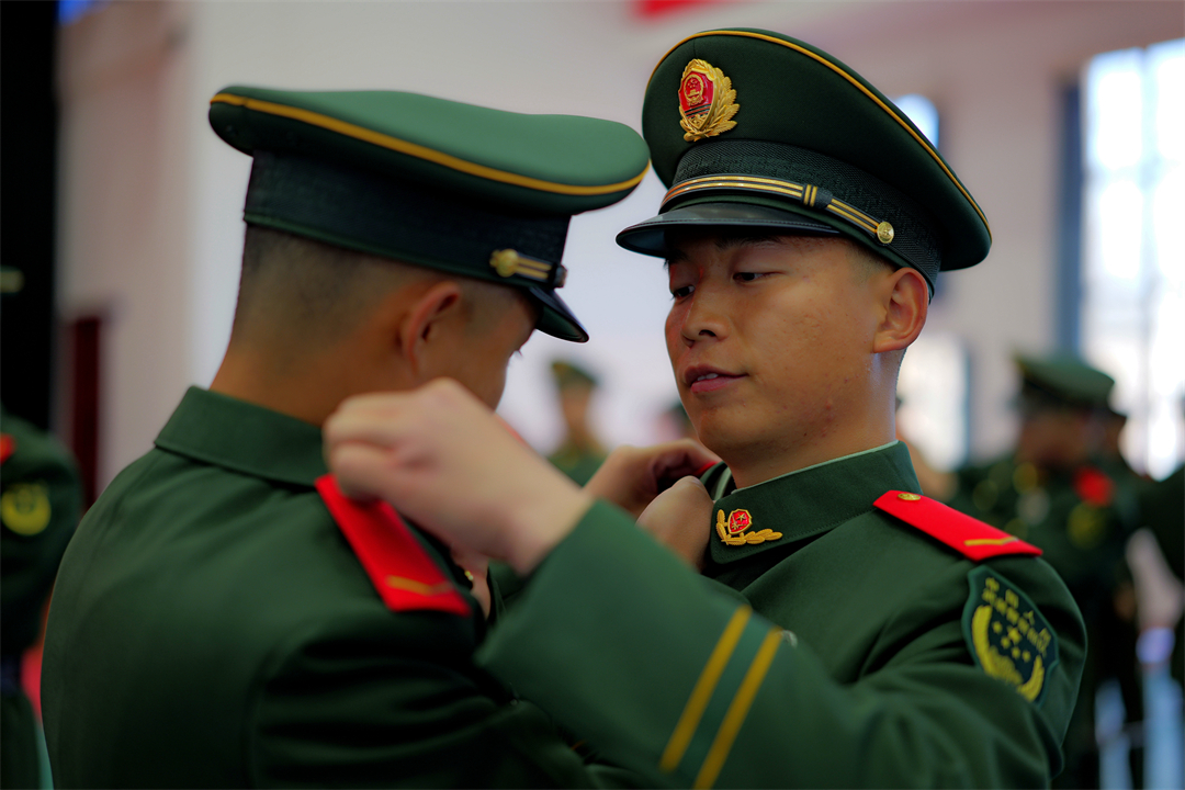 “經研究決定,授予以下同志列兵軍銜……”一紙命令,是對他們艱苦訓練最好的褒獎;一枚軍銜,承載著軍人的信仰和傳承。軍銜上肩,新兵入列,“一道拐”的軍旅青春就此啟航。這一刻,新兵們實現(xiàn)了從地方青年到合格軍人的華麗轉身。