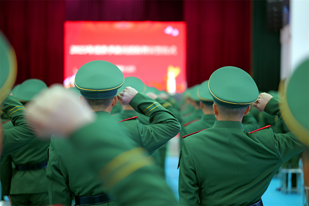 “我是中國人民解放軍軍人,我宣誓……”在軍旗的見證下,全體新兵高舉右拳鄭重宣誓,誓言鏗鏘,彰顯著堅定信仰,軍銜雖小,承載著如山重任。
