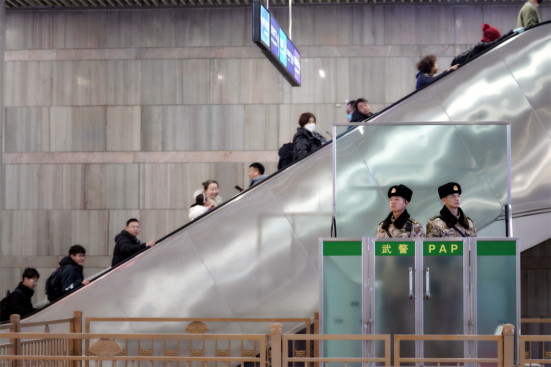 圖為執(zhí)勤武警守護(hù)著行色匆匆的旅客。