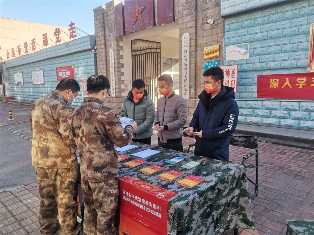 圖為河北省清河縣人武部聯(lián)合駐地法院、檢察院、退役軍人事務(wù)局向全體官兵和社會(huì)民眾進(jìn)行普法宣傳。耿月磊 攝