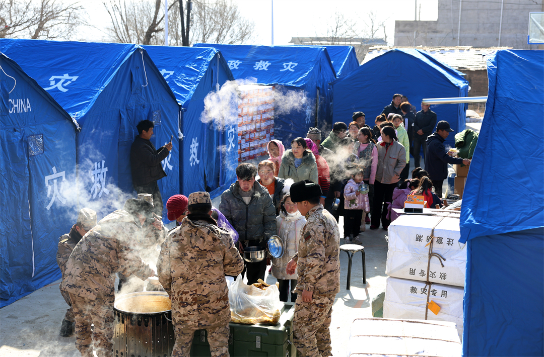 圖為12月21日,武警甘肅總隊臨夏支隊官兵在積石山縣劉集鄉(xiāng)陽屲村為受災(zāi)群眾供應(yīng)熱食。