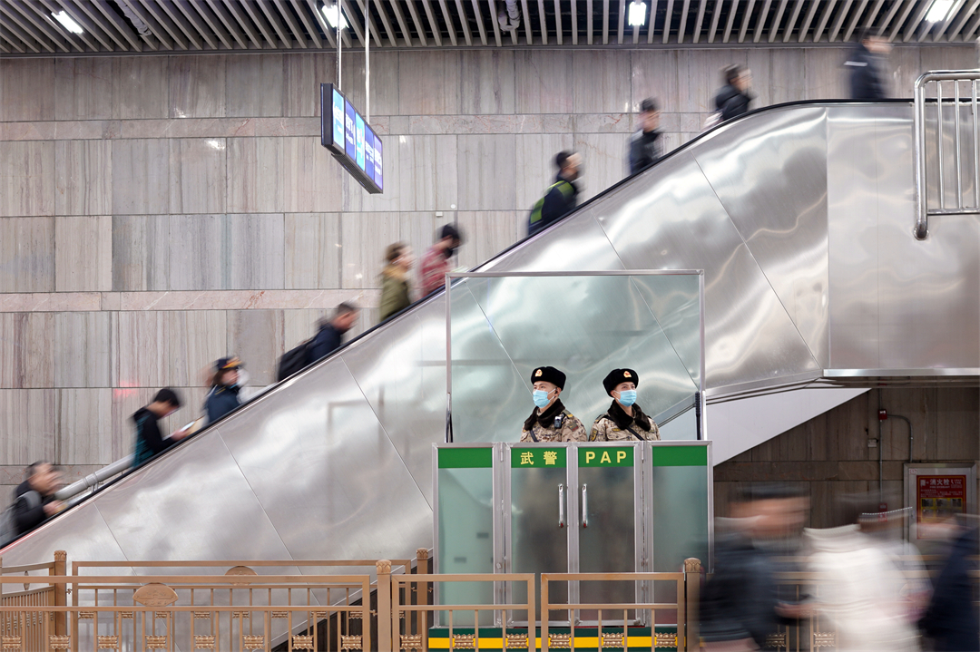 圖為北京西站地下通道內(nèi)兩名武警官兵在認真執(zhí)勤。
