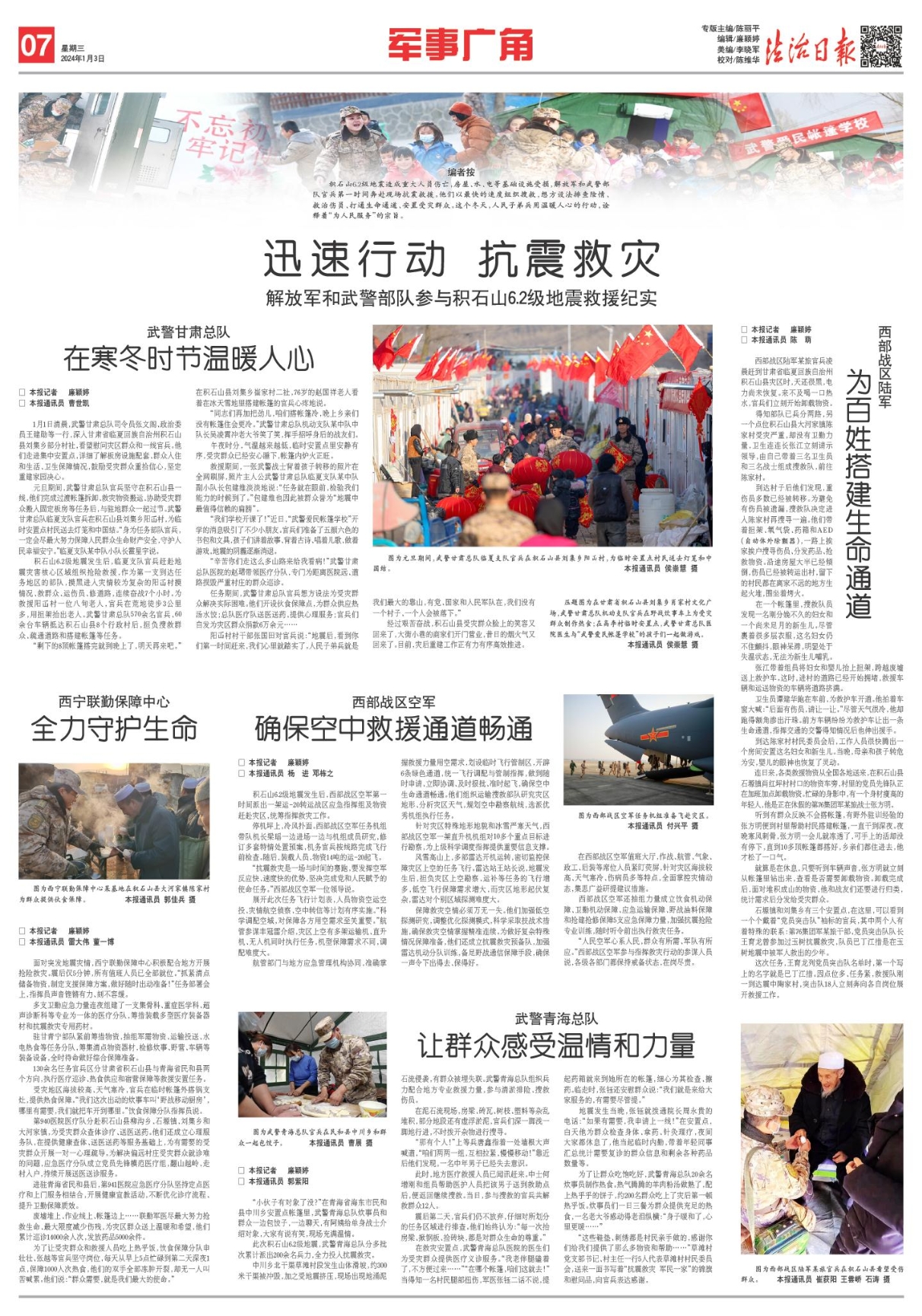 積石山6.2級地震造成重大人員傷亡,房屋、水、電等基礎(chǔ)設(shè)施受損,解放軍和武警部隊(duì)官兵第一時(shí)間奔赴現(xiàn)場抗震救援。他們以最快的速度組織搜救,想方設(shè)法排查險(xiǎn)情、救治傷員、打通生命通道、安置受災(zāi)群眾。這個(gè)冬天,人民子弟兵用溫暖人心的行動,詮釋著“為人民服務(wù)”的宗旨。