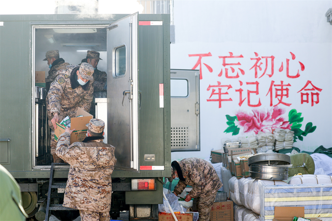 圖為西寧聯(lián)勤保障中心某基地在積石山縣大河家鎮(zhèn)陳家村為群眾提供伙食保障。郭佳兵 攝