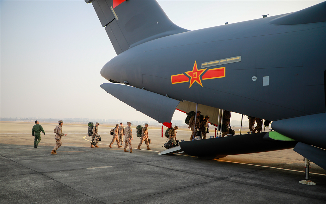 停機(jī)坪上,冷風(fēng)撲面。西部戰(zhàn)區(qū)空軍任務(wù)機(jī)組帶隊(duì)機(jī)長梁瑤一邊進(jìn)場一邊與機(jī)組成員研究,修訂多套特情處置預(yù)案,機(jī)務(wù)官兵按線路完成飛行前檢查。隨后,裝載人員、物資14噸的運(yùn)-20起飛。