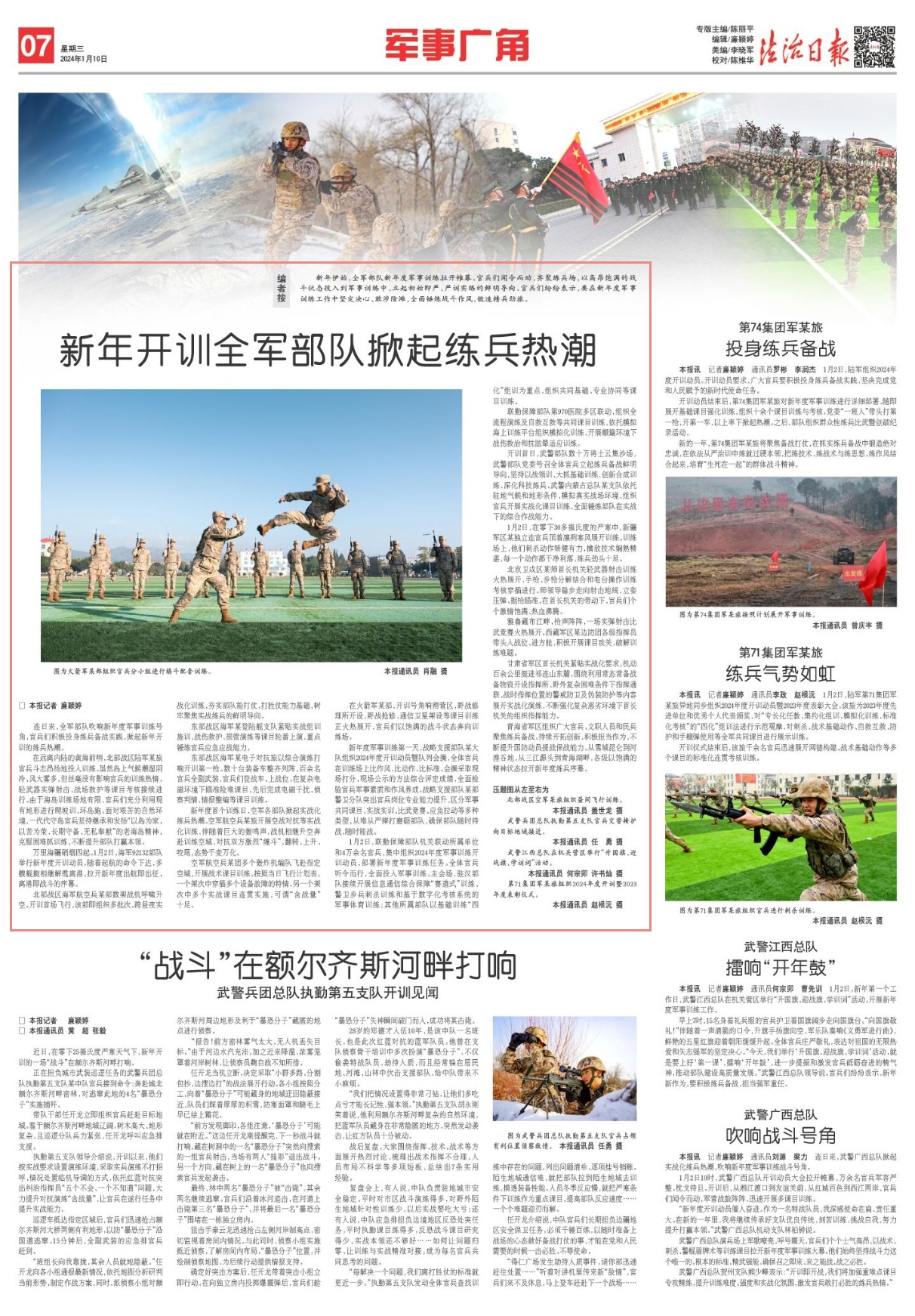 1月2日,聯(lián)勤保障部隊機關(guān)聯(lián)動所屬單位和4萬余名官兵,集中組織2024年度軍事訓練開訓動員,部署新年度軍事訓練任務。全體官兵聽令而行,全面投入軍事訓練。主會場,駐漢部隊接續(xù)開展信息通信綜合保障“賽道式”訓練、警衛(wèi)步兵刺殺訓練和基于數(shù)字化考核系統(tǒng)的軍事體育訓練;其他所屬部隊以基礎(chǔ)訓練“四化”組訓為重點,組織共同基礎(chǔ)、專業(yè)協(xié)同等課目訓練。