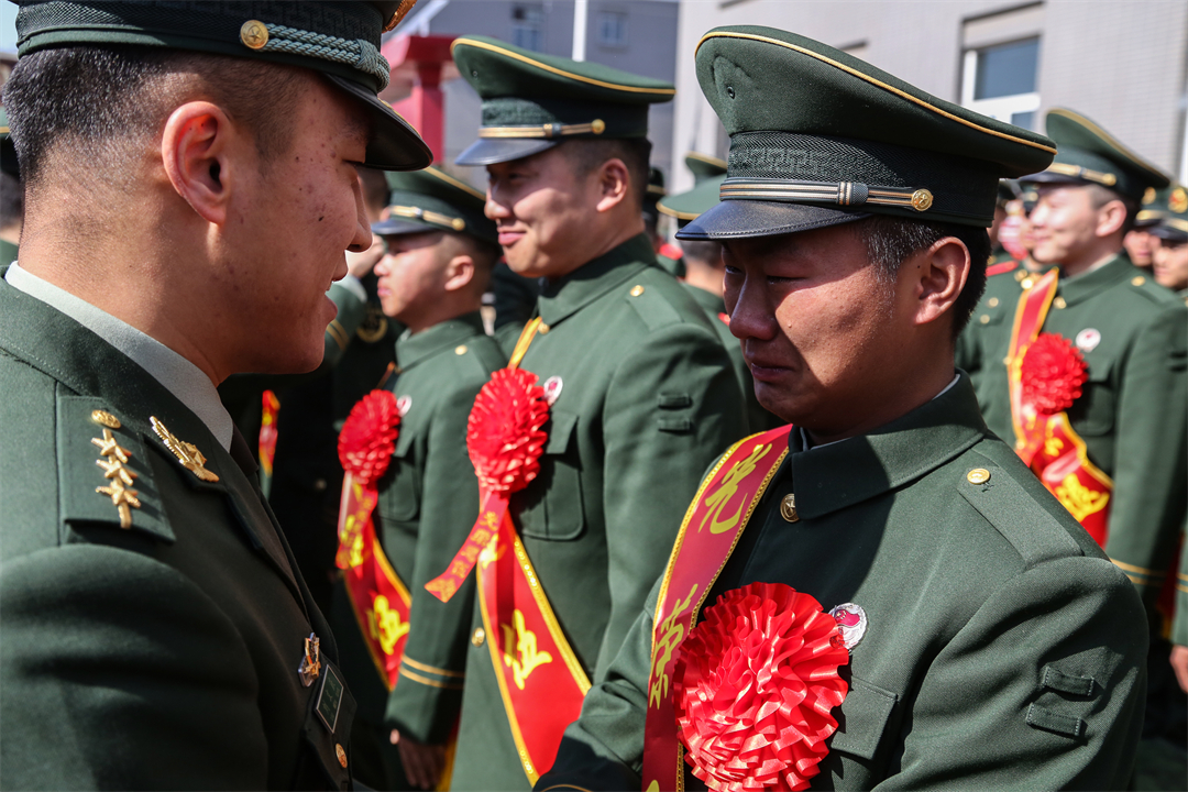 “命令!馬龍等同志退出現(xiàn)役!”退役命令下達后,官兵們紛紛為老兵卸下軍銜和標志服飾,老兵們眼含熱淚與戰(zhàn)友依依惜別,相互表達著美好祝愿。