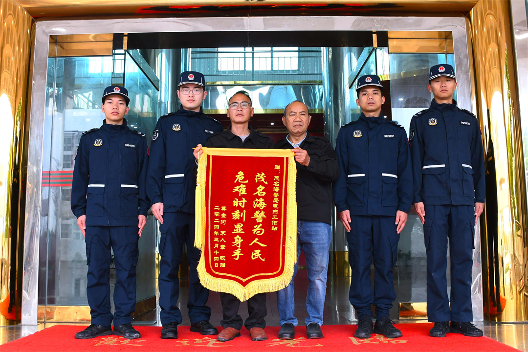 3月14日下午,水東灣海洋公園兩名工作人員攜帶一面印有“茂名海警為人民 危難時刻顯身手”的錦旗,來到廣東茂名海警局電白工作站,專程向?qū)ζ鋵嵤┚仍暮>瘓?zhí)法員表示感謝。