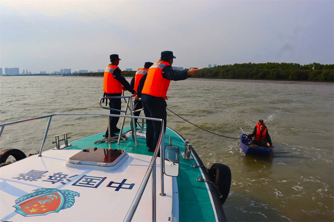 抵達目標海域后,執(zhí)法員發(fā)現(xiàn)受困群眾在大洲島岸邊焦急地揮手求救。因該處水深不足,幾次涉水都無法靠岸。見此緊急情況,執(zhí)法員一邊喊話安撫,一邊指導受困群眾乘坐自身無動力船舶劃向我方。