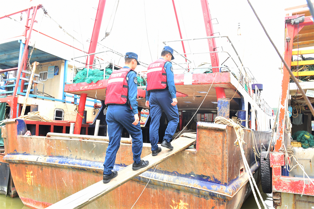 圖為海警執(zhí)法員登船普及防臺防汛知識。