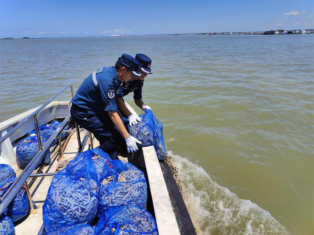 圖為8月3日,廣東湛江海警局在湛江附近海域抓獲一艘非法捕撈漁船,執(zhí)法員依法對(duì)非法捕撈活體漁獲物進(jìn)行放生處理。