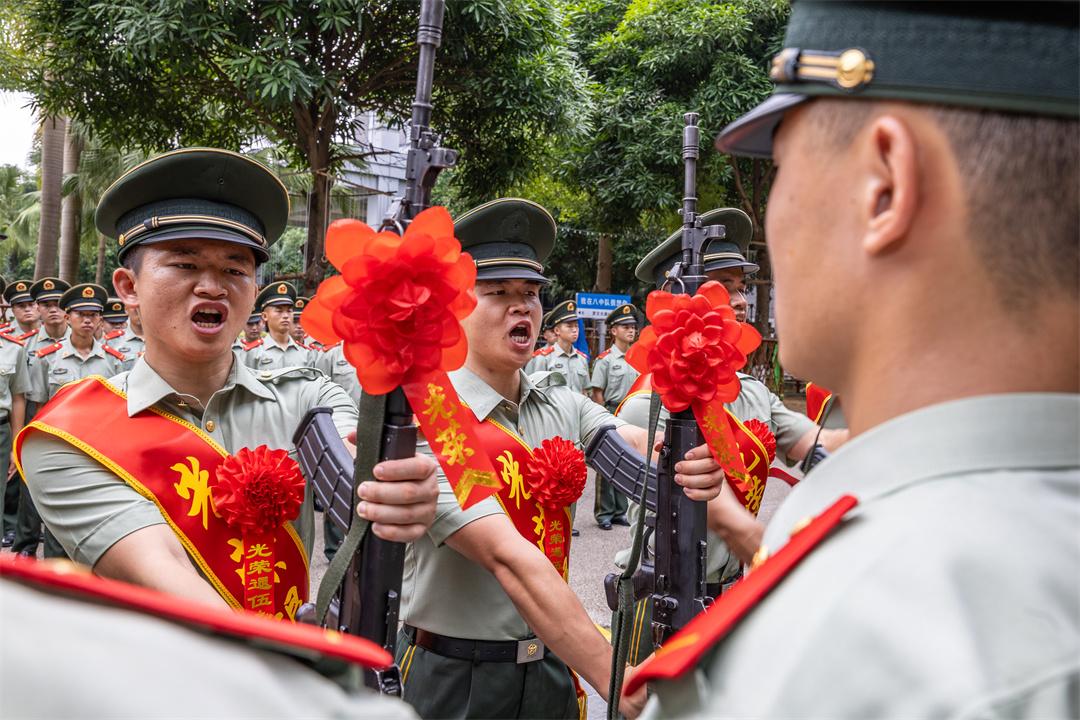 在該支隊某基層單位,一場熱鬧非凡的篝火晚會別開生面,火光映照在他們剛毅的面龐上,官兵們手拉手圍著熊熊燃燒的篝火舞動歌唱。薪火相傳,傳承的還有軍人的使命。在新老兵交接槍儀式上,退伍老兵們鄭重地把陪伴已久的武器交給剛下隊的新兵,勉勵他們刻苦磨煉本領(lǐng),早日成為單位建設(shè)骨干。
