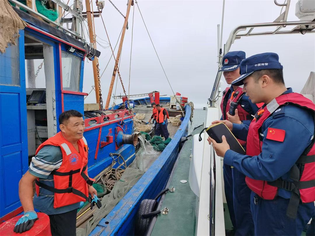 圖為9月5日,山東煙臺(tái)海警局長島工作站執(zhí)法員在轄區(qū)海域登檢作業(yè)漁船。劉鑫 攝
