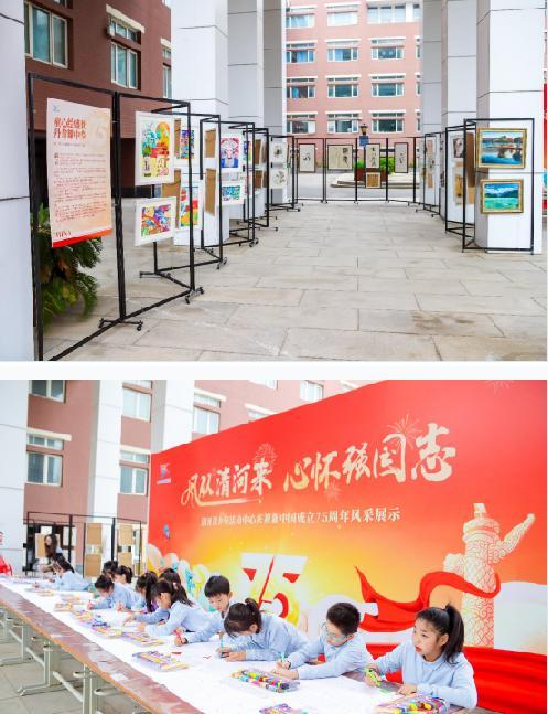 戶(hù)外展區(qū),“童心繪盛世,丹青耀中華”書(shū)畫(huà)作品展率先引爆全場(chǎng)。國(guó)畫(huà)、油畫(huà)、素描、彩鉛、漫畫(huà)……一幅幅由學(xué)生精心創(chuàng)作的作品琳瑯滿(mǎn)目,色彩斑斕,每一筆都透露出孩子們對(duì)祖國(guó)的深情厚意和對(duì)美好生活的無(wú)限憧憬。特別是那幅由16位學(xué)生共同手繪的7.5米長(zhǎng)的巨型畫(huà)卷,如同絢麗的彩虹,將孩子們的夢(mèng)想與祖國(guó)的未來(lái)緊緊相連。
