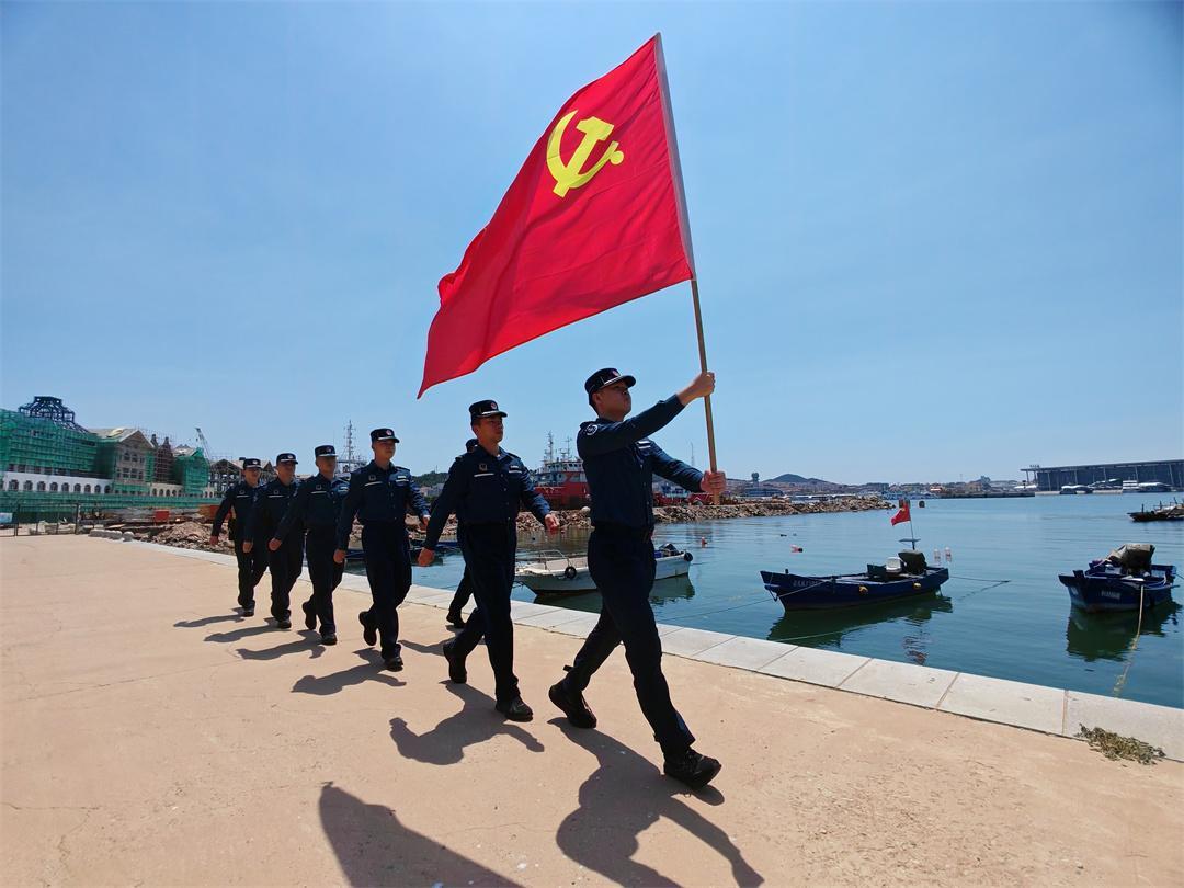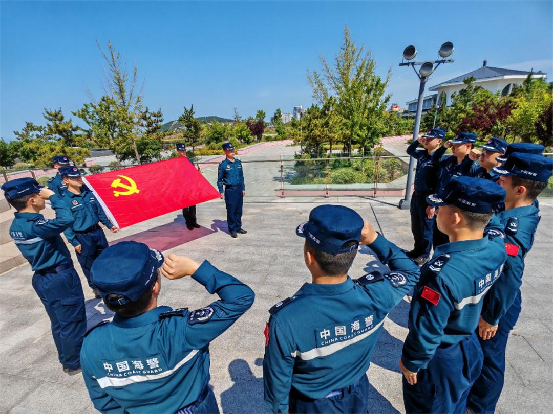 圖為山東煙臺(tái)海警局長(zhǎng)島工作站組織執(zhí)法員重溫入黨誓詞。盧煜萱 攝
