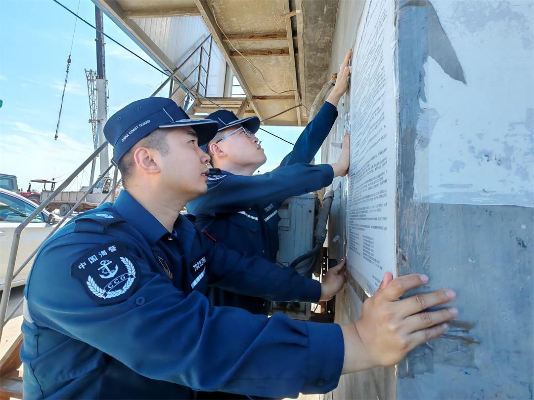 圖為山東煙臺(tái)海警局長(zhǎng)島工作站執(zhí)法員在轄區(qū)北長(zhǎng)山島北城碼頭張貼執(zhí)法公告。盧煜萱 攝