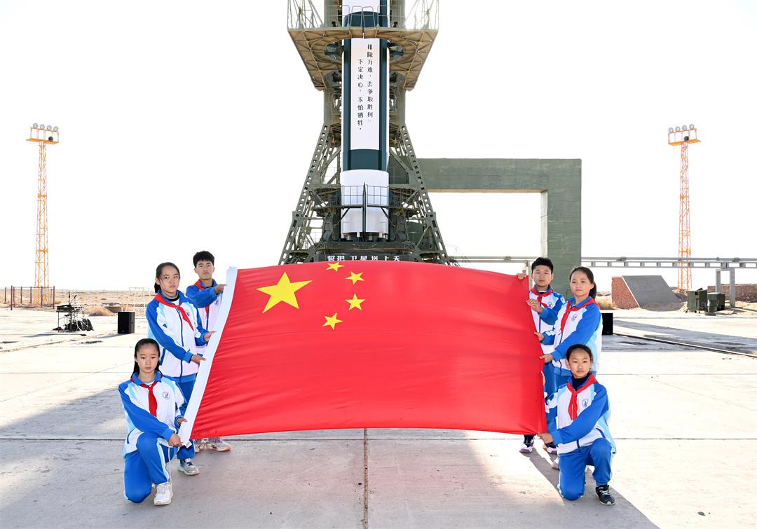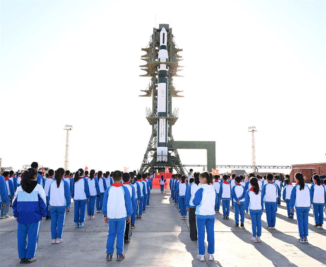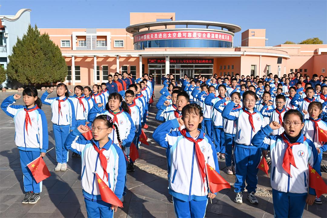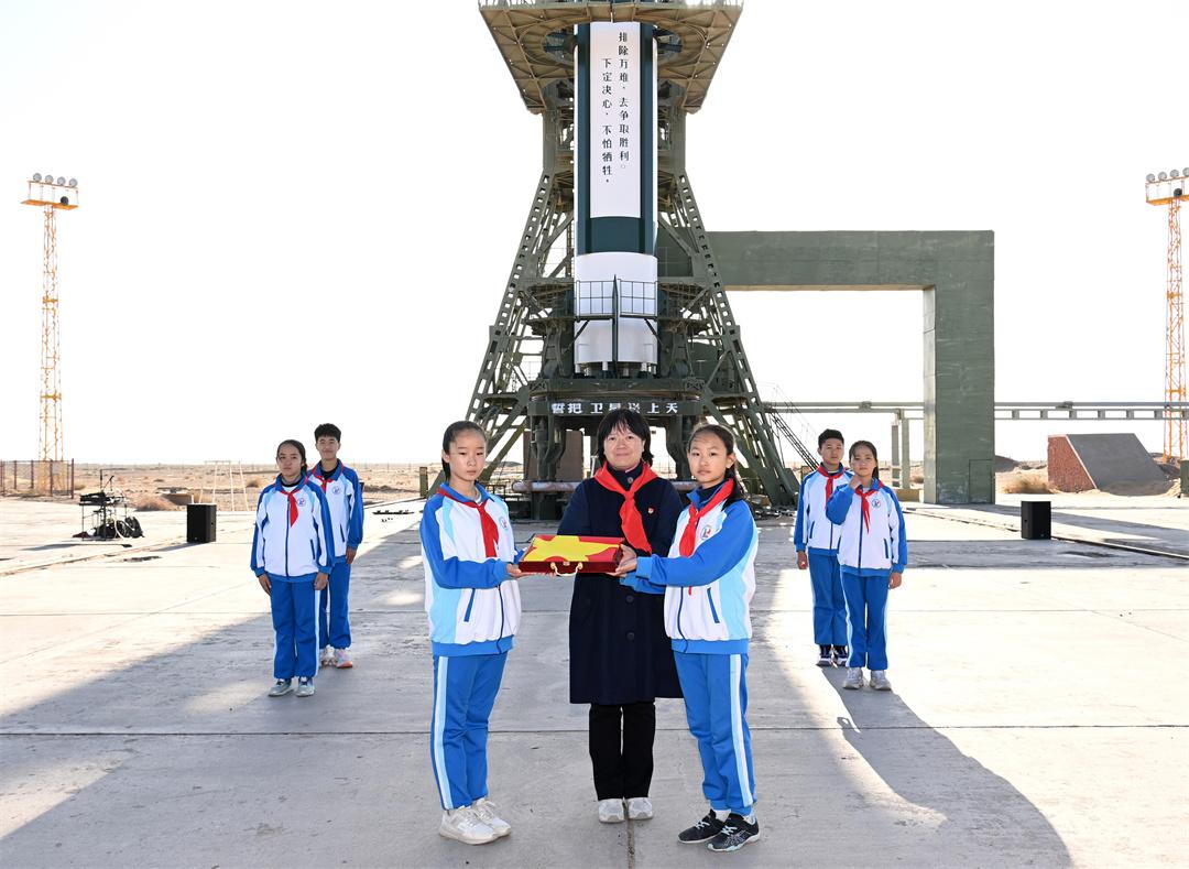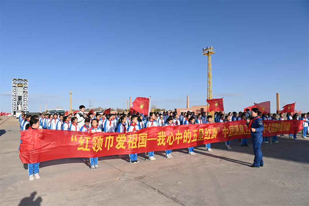 隨后,少先隊員們帶著國旗前往載人航天發(fā)射場。神舟十九號載人飛船發(fā)射任務(wù)0號指揮員趙磊為少先隊員們介紹了這座我國目前唯一的載人航天發(fā)射塔架。就在前幾天,神舟十九號航天員乘組從這里飛向中國空間站。截至目前,這里發(fā)射了19艘神舟飛船,將24名38人次航天員送入太空。這面滿載榮譽的國旗正是從這個塔架上隨航天員一同進入中國空間站。