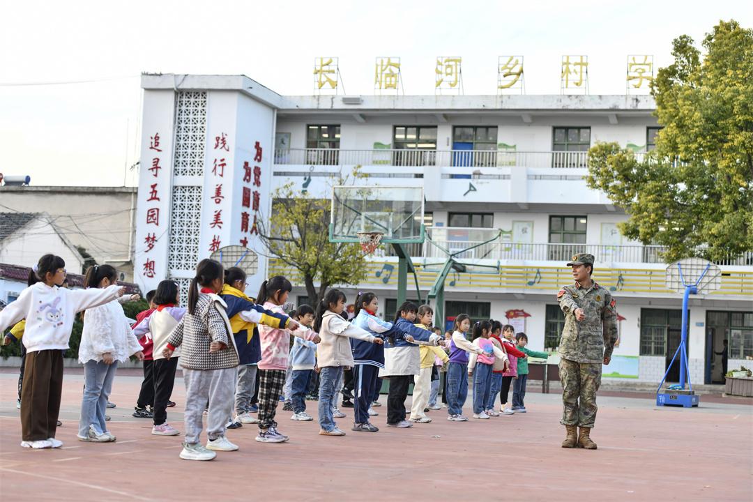 圖為在肥東縣長(zhǎng)臨河學(xué)校中心小學(xué),孩子們體驗(yàn)軍事動(dòng)作。