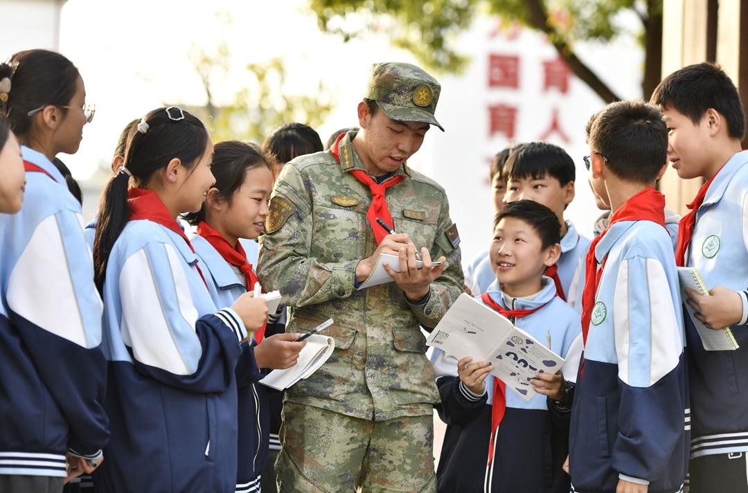 圖為在肥東縣長(zhǎng)臨河學(xué)校中心小學(xué),某部指導(dǎo)員魏力源給孩子們寫(xiě)寄語(yǔ)。