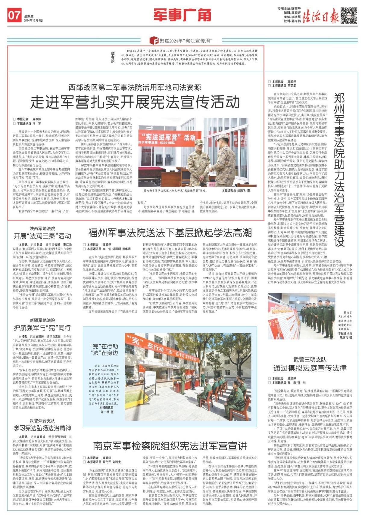12月4日是第十一個(gè)國家憲法日,日前,中央宣傳部、司法部、全國普法辦聯(lián)合印發(fā)通知,以“大力弘揚(yáng)憲法精神,推動(dòng)進(jìn)一步全面深化改革”為主題,在全國組織開展2024年“憲法宣傳周”活動(dòng)?;顒?dòng)期間,軍地法院、檢察院聯(lián)合部隊(duì),通過宣講授課、贈(zèng)送法律書籍、模擬庭審、現(xiàn)場提供法律咨詢等多種形式開展送法進(jìn)軍營活動(dòng),形成上下聯(lián)動(dòng)、共同參與、整體推進(jìn)的憲法宣傳教育格局,不斷推動(dòng)憲法宣傳教育取得實(shí)效,助力部隊(duì)法治軍營建設(shè)。