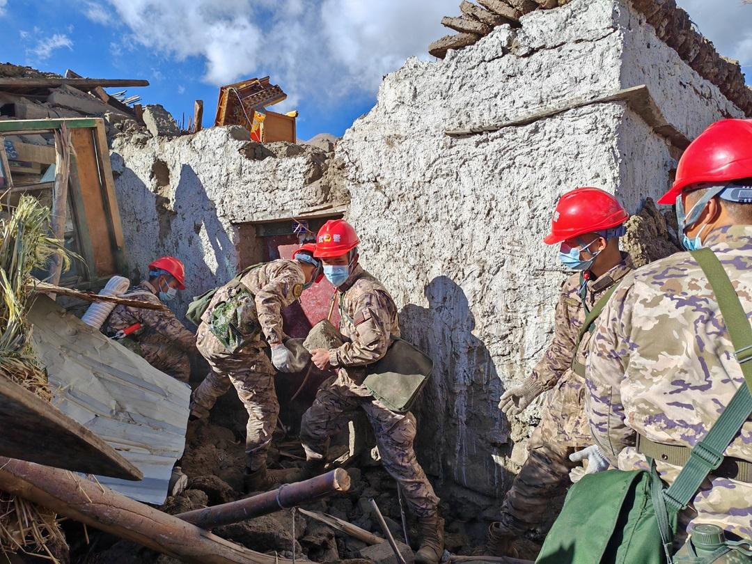 圖為武警西藏總隊(duì)日喀則支隊(duì)官兵在定日縣長(zhǎng)所鄉(xiāng)嘎丹村搶救群眾財(cái)產(chǎn)。張鈺 攝