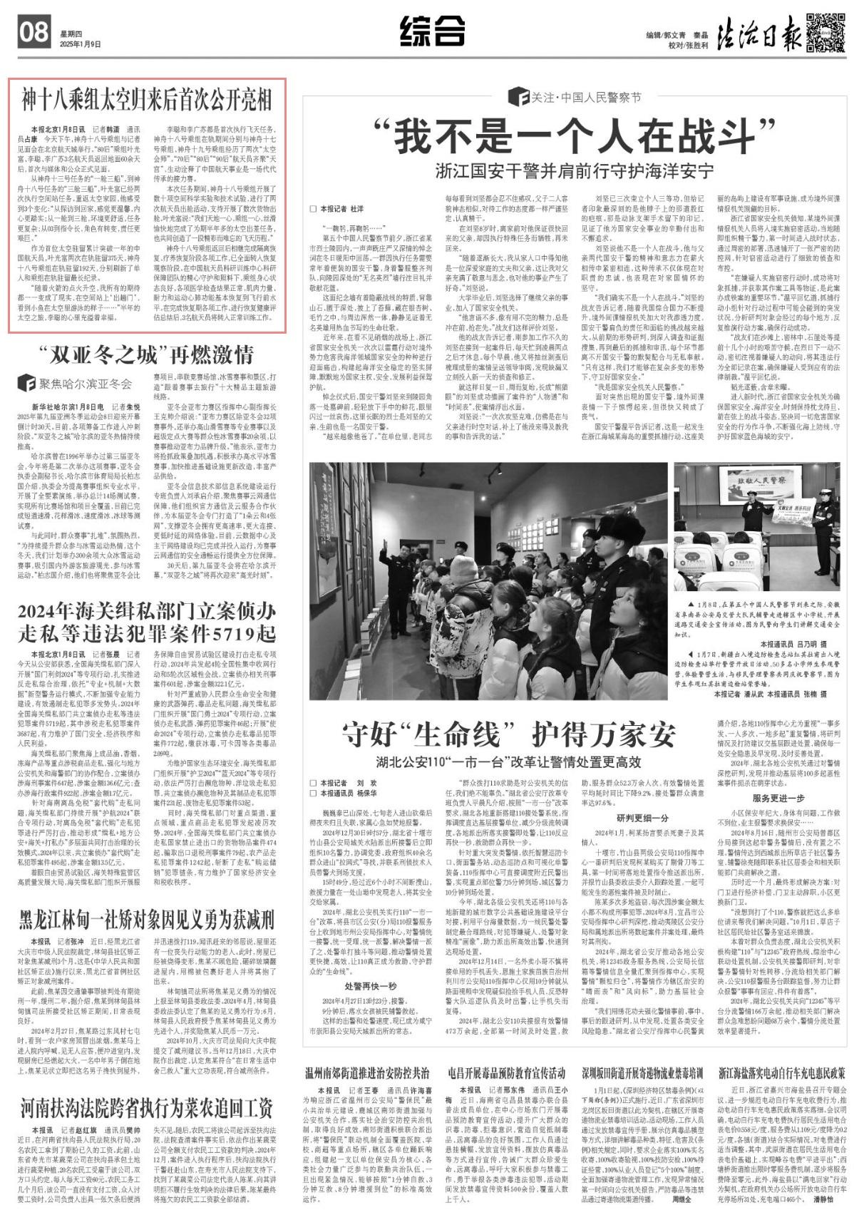 1月8日下午,神舟十八號(hào)乘組與記者見面會(huì)在北京航天城舉行。“80后”乘組葉光富、李聰、李廣蘇3名航天員返回地面60余天后,首次與媒體和公眾正式見面。