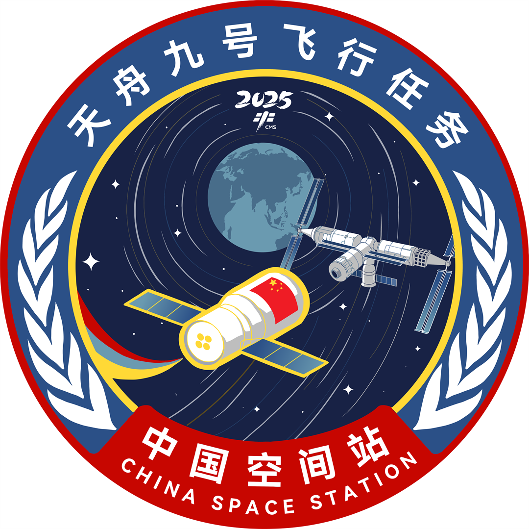 天舟九號(hào)飛行任務(wù)標(biāo)識(shí),以地球?yàn)楸尘?,飛船與空間站交會(huì)對(duì)接為視覺(jué)中心,展現(xiàn)二者環(huán)繞飛行的壯麗姿態(tài)。飛船的動(dòng)感弧線代表飛行軌跡,傳遞精準(zhǔn)和力量的美感。星軌巧繪數(shù)字“9”,九顆星辰環(huán)繞其間,寓意天舟九號(hào)邁向未來(lái),承載著探索太空的遠(yuǎn)大理想與團(tuán)隊(duì)協(xié)作精神。標(biāo)識(shí)外圈紅色熾熱,象征國(guó)家榮譽(yù)與使命;金色點(diǎn)綴其間,輝映輝煌成就。內(nèi)圈深藍(lán)如宇宙,廣袤無(wú)垠,襯托出白色空間站與飛船。