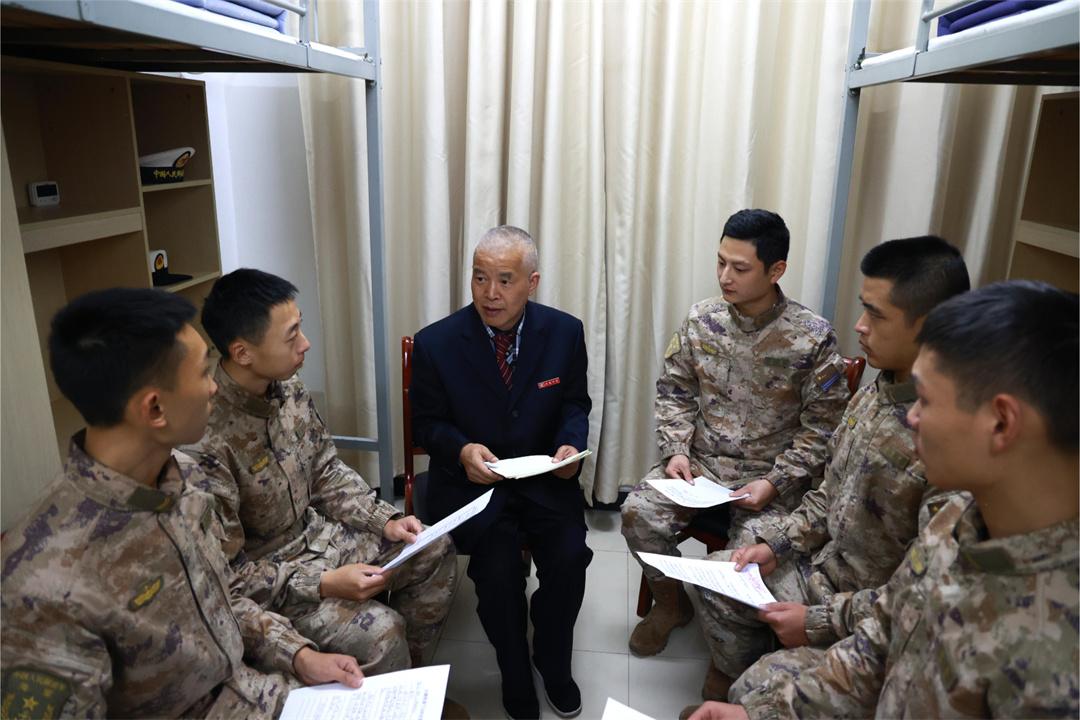 圖為大榭中學(xué)退休教師胡四海(左三)向官兵分享師生與駐南沙島礁官兵“鴻雁傳書”的故事。
