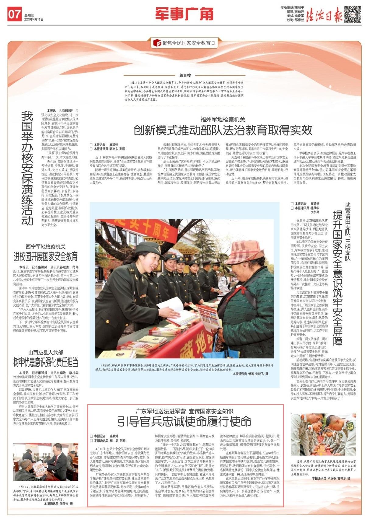 4月15日,在第十個(gè)全民國(guó)家安全教育日到來(lái)之際,廣東省軍地以“維護(hù)國(guó)家安全,忠誠(chéng)履行使命”為主題,結(jié)合國(guó)家安全教育與部隊(duì)實(shí)際需求,深入駐粵部隊(duì),通過(guò)專題授課、文藝展演、圖片展示等形式宣傳貫徹國(guó)家安全知識(shí),引導(dǎo)官兵忠誠(chéng)使命、履行使命。