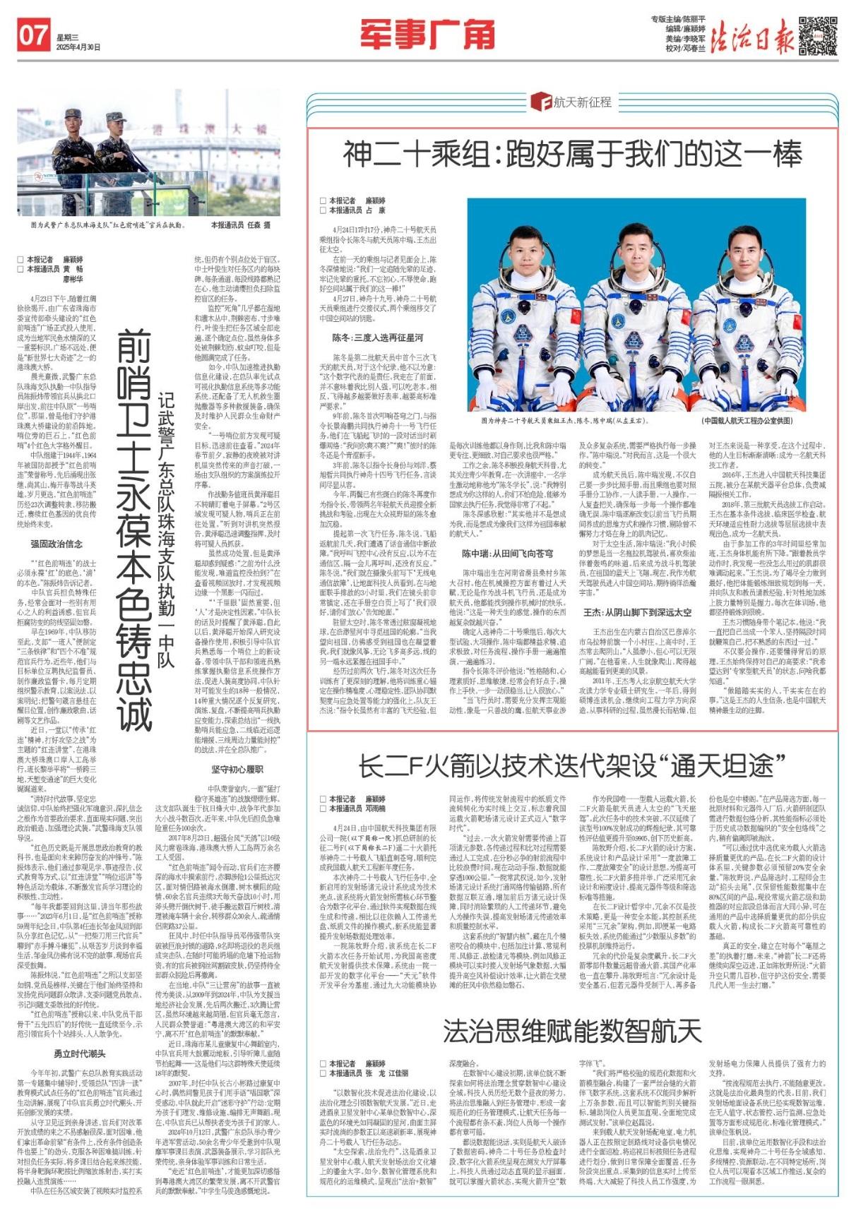 4月24日17時17分,神舟二十號航天員乘組指令長陳冬與航天員陳中瑞、王杰出征太空。