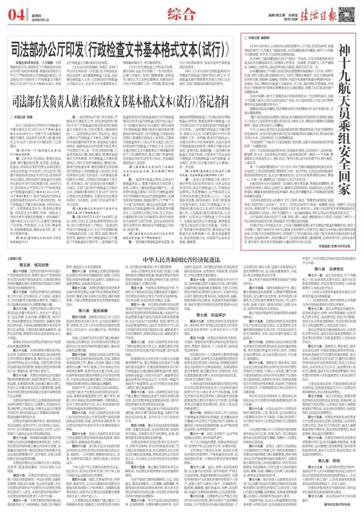 4月30日13時08分,以每秒7.9公里的速度沖入大氣層、經(jīng)受住2000℃高溫考驗的神舟十九號載人飛船返回艙,在東風著陸場成功著陸。神舟十九號航天員蔡旭哲、宋令東、王浩澤安全順利出艙。