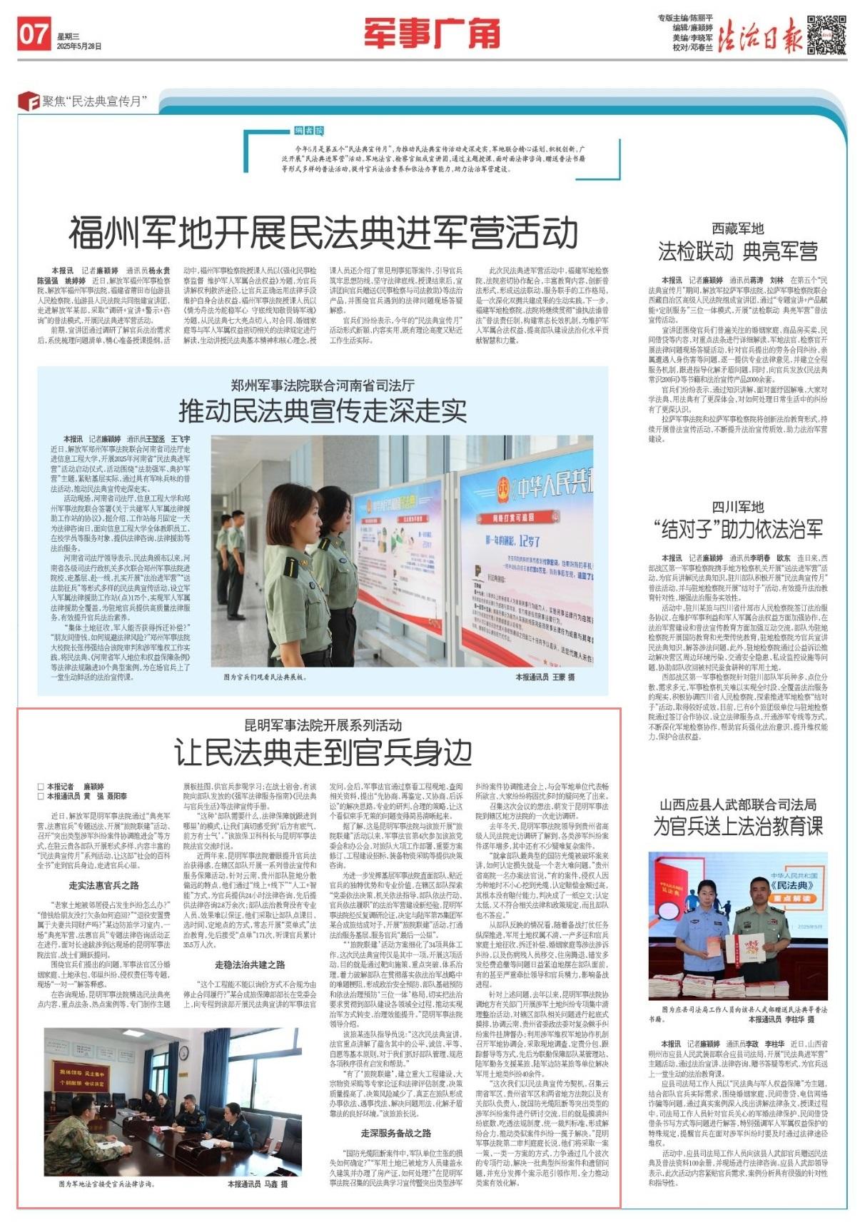 近日,解放軍昆明軍事法院通過“典亮軍營(yíng)、法惠官兵”專題送法、開展“旅院聯(lián)建”活動(dòng)、召開“突出類型涉軍糾紛案件協(xié)調(diào)推進(jìn)會(huì)”等方式,在駐云貴各部隊(duì)開展形式多樣、內(nèi)容豐富的“民法典宣傳月”系列活動(dòng),讓這部“社會(huì)的百科全書”走到官兵身邊,走進(jìn)官兵心里。