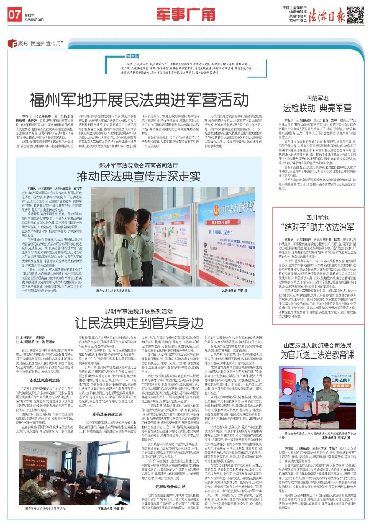連日來,西部戰(zhàn)區(qū)第一軍事檢察院攜手地方檢察機(jī)關(guān)開展“送法進(jìn)軍營(yíng)”活動(dòng),為官兵講解民法典知識(shí)。駐川部隊(duì)積極開展“民法典宣傳月”普法活動(dòng),并與駐地檢察院開展“結(jié)對(duì)子”活動(dòng),有效提升法治教育針對(duì)性,增強(qiáng)法治服務(wù)實(shí)效性。