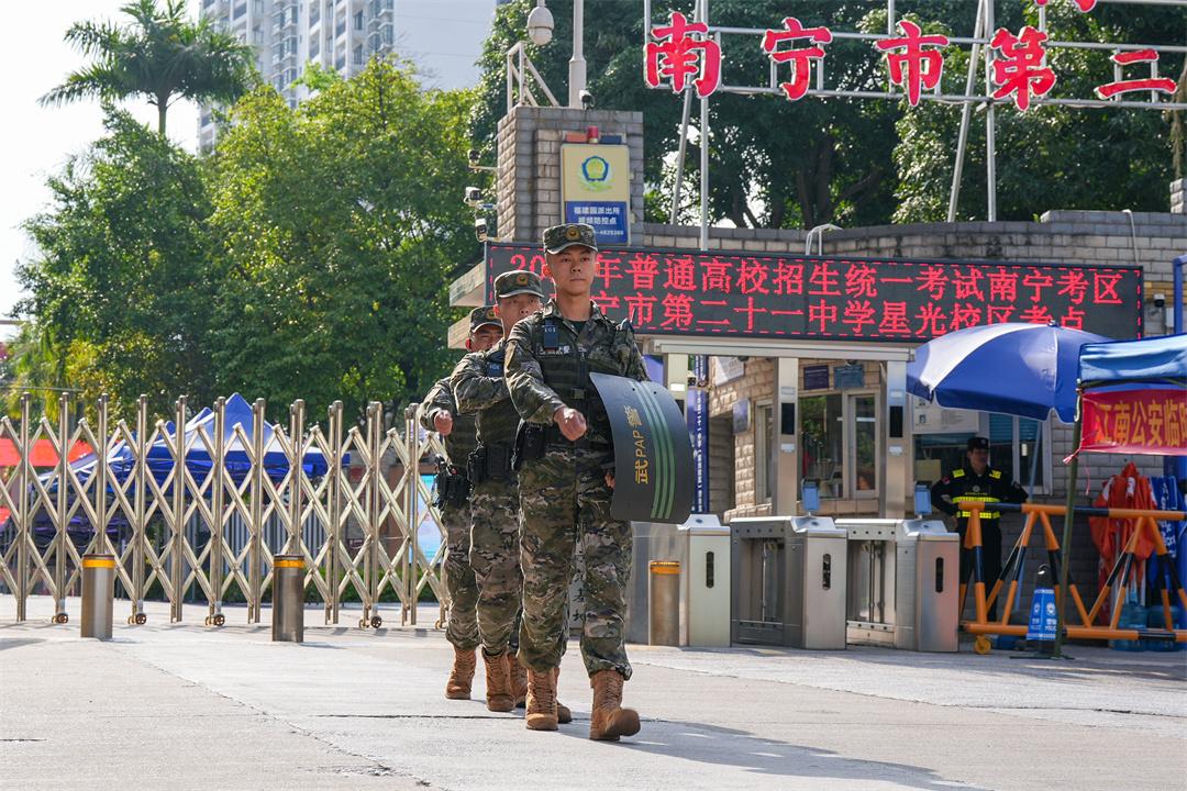 今年高考期間,武警廣西總隊南寧支隊科學優(yōu)化執(zhí)勤編組,在駐地各考點嚴密部署定點警戒、徒步巡邏與車巡力量,全方位保障考生安全,確保高考順利進行。