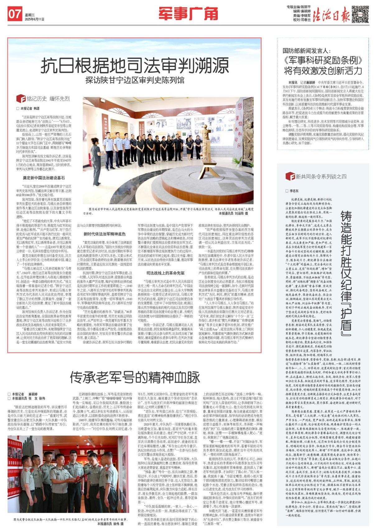 徐斌告訴記者,我軍在抗日戰(zhàn)爭(zhēng)時(shí)期的軍事司法制度與實(shí)踐,是中國(guó)共產(chǎn)黨領(lǐng)導(dǎo)下軍事法治建設(shè)的早期探索,是在血與火的斗爭(zhēng)中孕育的法治智慧,穿越歷史成為新時(shí)代依法治軍戰(zhàn)略的邏輯起點(diǎn)和精神底色。時(shí)刻警示著我們要按照法治要求轉(zhuǎn)變治軍方式,不斷強(qiáng)化全體官兵法治信仰和法治思維;要在不斷增強(qiáng)軍事法規(guī)制度執(zhí)行力的過(guò)程中,把法的權(quán)威牢牢樹立起來(lái);要以史為鑒、繼往開來(lái),從紅色法治傳統(tǒng)中汲取力量,推動(dòng)軍事法治建設(shè)向更高水平發(fā)展。