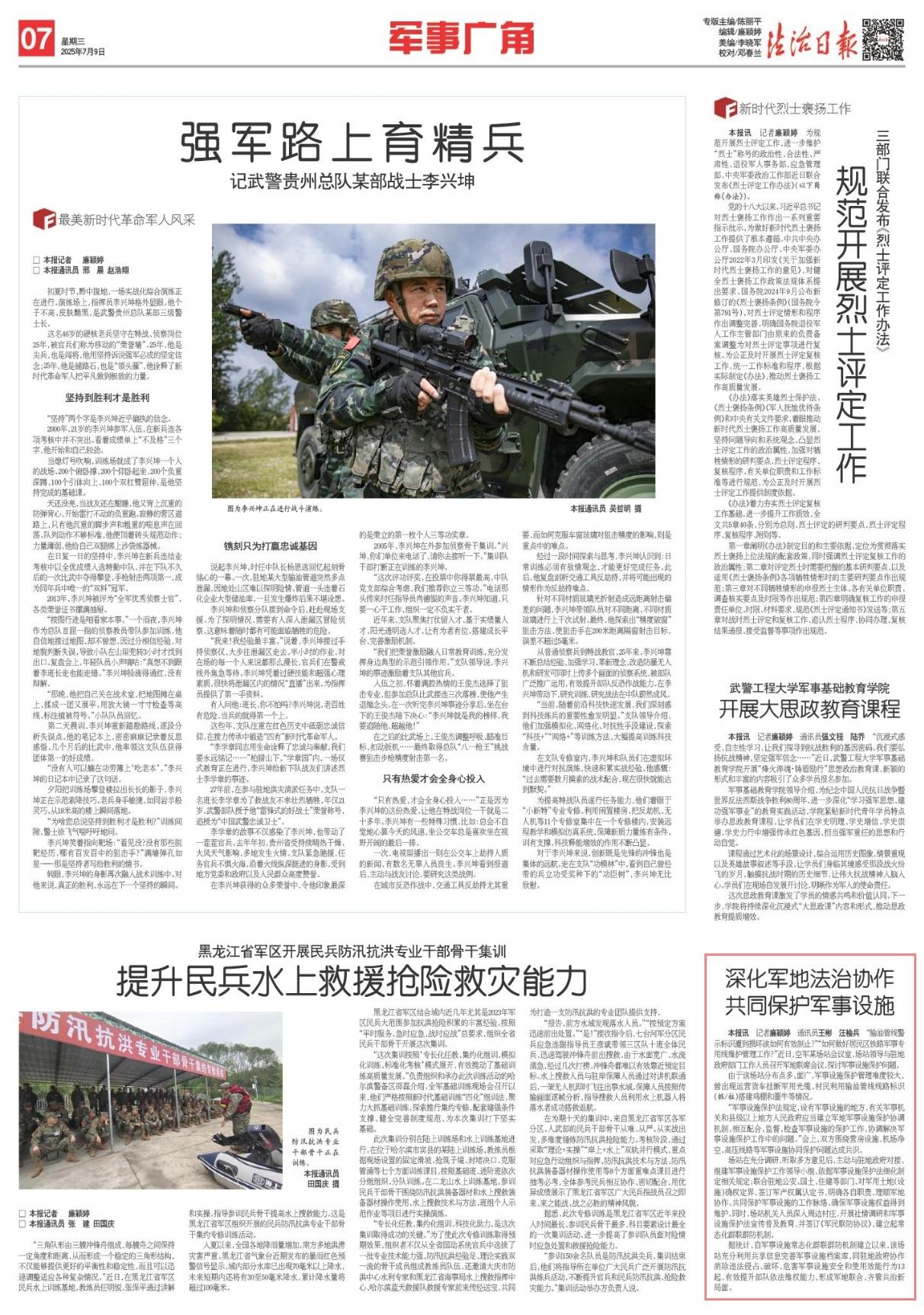 “軍事設(shè)施保護法規(guī)定,設(shè)有軍事設(shè)施的地方,有關(guān)軍事機關(guān)和縣級以上地方人民政府應(yīng)當建立軍地軍事設(shè)施保護協(xié)調(diào)機制,相互配合,監(jiān)督、檢查軍事設(shè)施的保護工作,協(xié)調(diào)解決軍事設(shè)施保護工作中的問題。”會上,雙方圍繞營房設(shè)施、機場凈空、高壓線路等軍事設(shè)施協(xié)同保護問題達成共識。