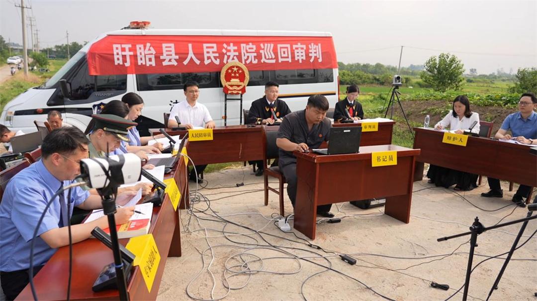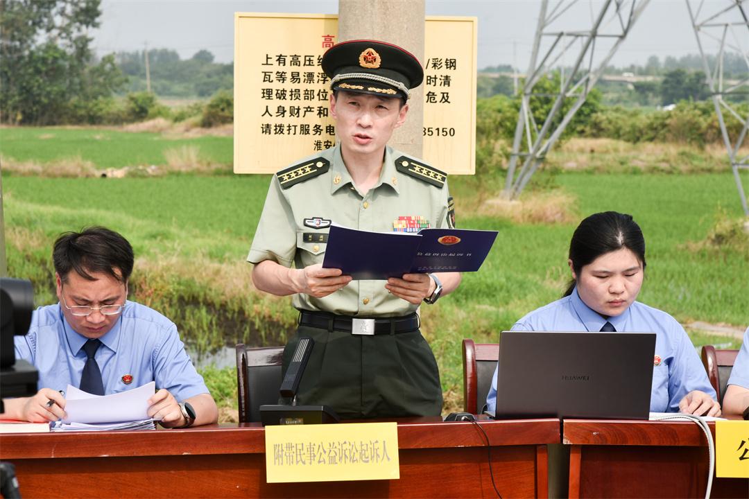 7月15日,解放軍南京軍事檢察院協(xié)同淮安市盱眙縣人民檢察院,對(duì)一起過失損壞軍事通信案提起刑事附帶民事公益訴訟,并在案發(fā)地盱眙縣馬壩鎮(zhèn)一處農(nóng)田間公開開庭審理。盱眙縣人民檢察院檢察長(zhǎng)潘凌云作為公訴人出庭指控犯罪,南京軍事檢察院大校檢察長(zhǎng)劉劍作為附帶民事公益訴訟起訴人出庭提起民事公益訴訟,盱眙縣人民法院院長(zhǎng)田庚擔(dān)任審判長(zhǎng)。為加大案件警示教育效果,庭審邀請(qǐng)全國(guó)人大代表、江蘇省人大代表、部隊(duì)有關(guān)人員,以及案發(fā)地附近村民100余人參與旁聽。
