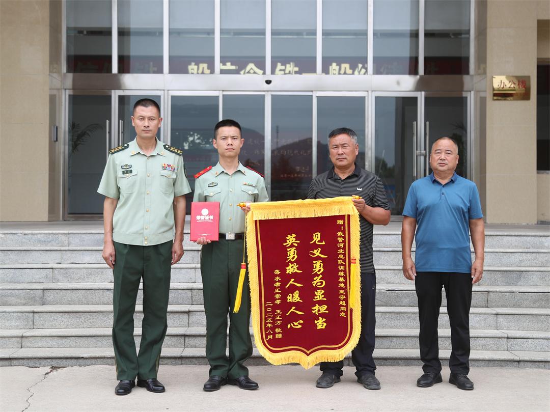 “感謝王守超同志救了我們兩個(gè)人,拯救了兩個(gè)家庭,武警戰(zhàn)士好樣的!”不久前,河南省濮陽(yáng)市范縣龍王莊鎮(zhèn)孟樓村村民王正方一行來(lái)到武警河北總隊(duì)訓(xùn)練基地,將一面繡著“見(jiàn)義勇為顯擔(dān)當(dāng) 英勇救人暖人心”的錦旗,以及范縣見(jiàn)義勇為評(píng)定委員會(huì)頒發(fā)的“見(jiàn)義勇為先進(jìn)個(gè)人”證書,鄭重遞到該基地王守超手中。