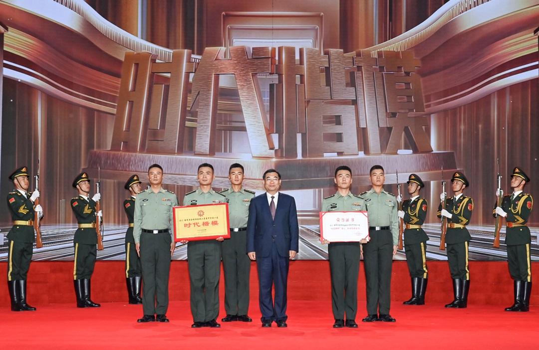 圖為在“時(shí)代楷模”發(fā)布儀式上,陸軍第八十二集團(tuán)軍某旅“劉老莊連”官兵代表領(lǐng)取“時(shí)代楷?!豹?jiǎng)牌和證書(shū)。張永進(jìn) 攝