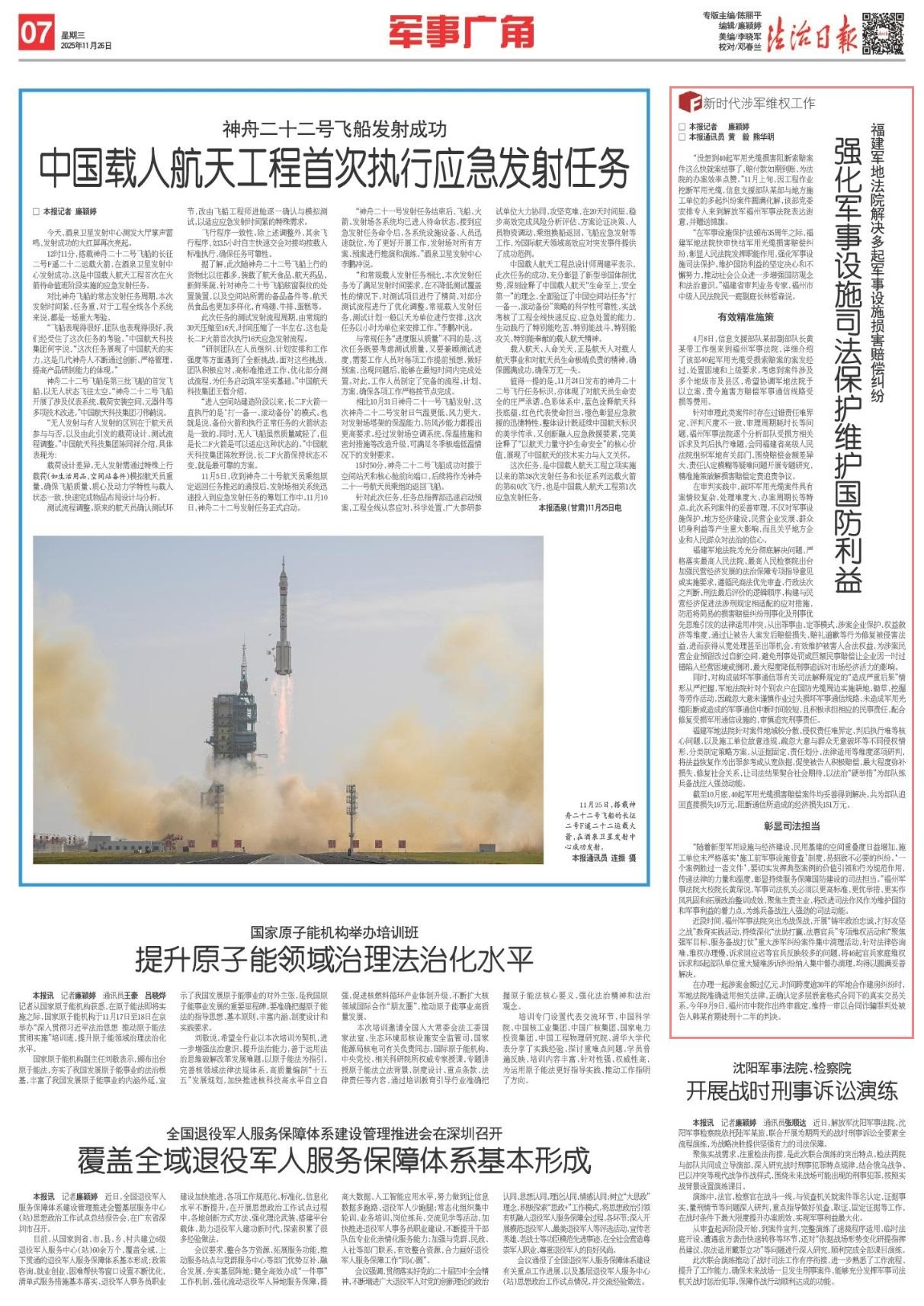 “在軍事設施保護法頒布35周年之際,福建軍地法院快審快結軍用光纜損害賠償糾紛,彰顯人民法院發(fā)揮職能作用,強化軍事設施司法保護、維護國防利益的堅定決心和不懈努力,推動社會公眾進一步增強國防觀念和法治意識?!备=ㄊ徟袠I(yè)務專家、福州市中級人民法院民一庭副庭長林哲森說。