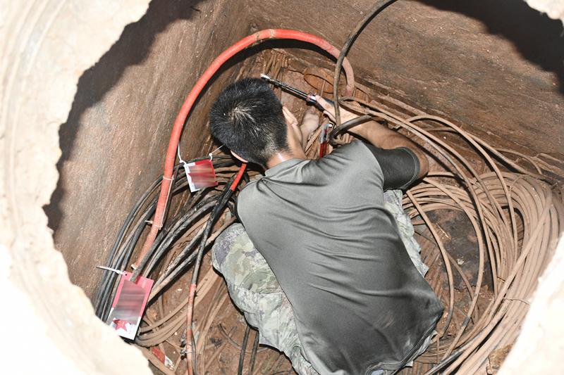 圖為官兵正在搶修被損壞軍用光纜。