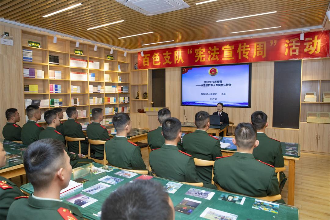 12月2日,武警廣西總隊(duì)百色支隊(duì)邀請駐地檢察院檢察官走進(jìn)軍營,開展“憲法宣傳周”活動(dòng),通過專題宣講、案例解析、現(xiàn)場咨詢等形式,為官兵送上精準(zhǔn)司法服務(wù),讓法治精神浸潤軍心。