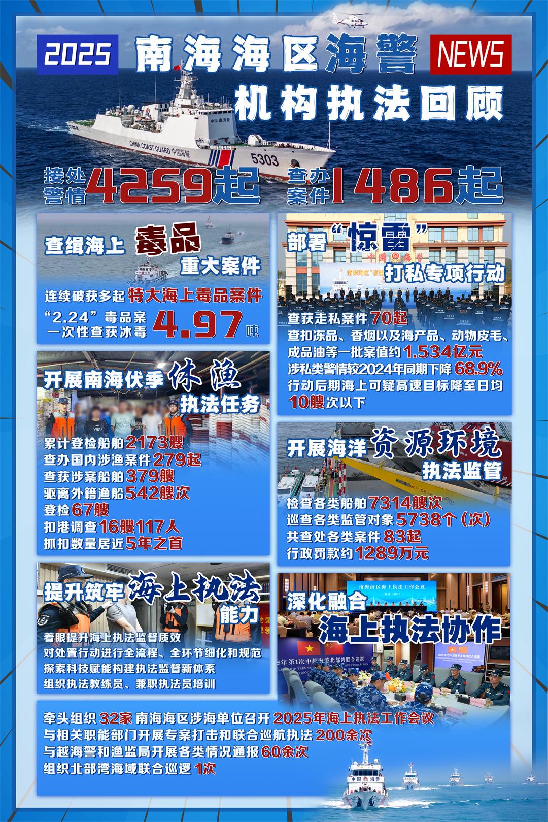 2025年,該局先后牽頭組織廣東、廣西、海南三?。▍^(qū))各級(jí)海警機(jī)構(gòu),開(kāi)展“驚雷”“凈?!薄氨毯!薄矮B獵”、伏季休漁等各項(xiàng)綜合執(zhí)法任務(wù),累計(jì)接處警情4259起,同比下降19.5%,查辦各類(lèi)案件1486起,同比上升0.9%,以實(shí)際行動(dòng)書(shū)寫(xiě)新時(shí)代南海海區(qū)執(zhí)法工作嶄新答卷。