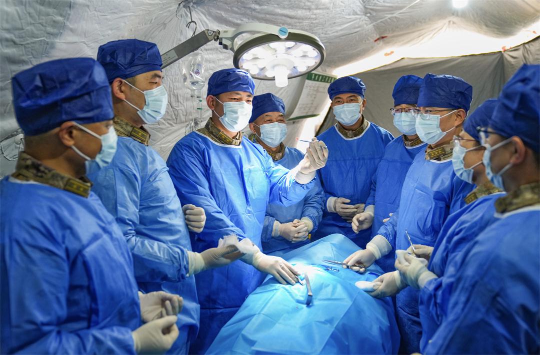 圖為博士團隊在野戰(zhàn)醫(yī)院帳篷里結(jié)合手術(shù)方案研究處置傷情。張永進 攝