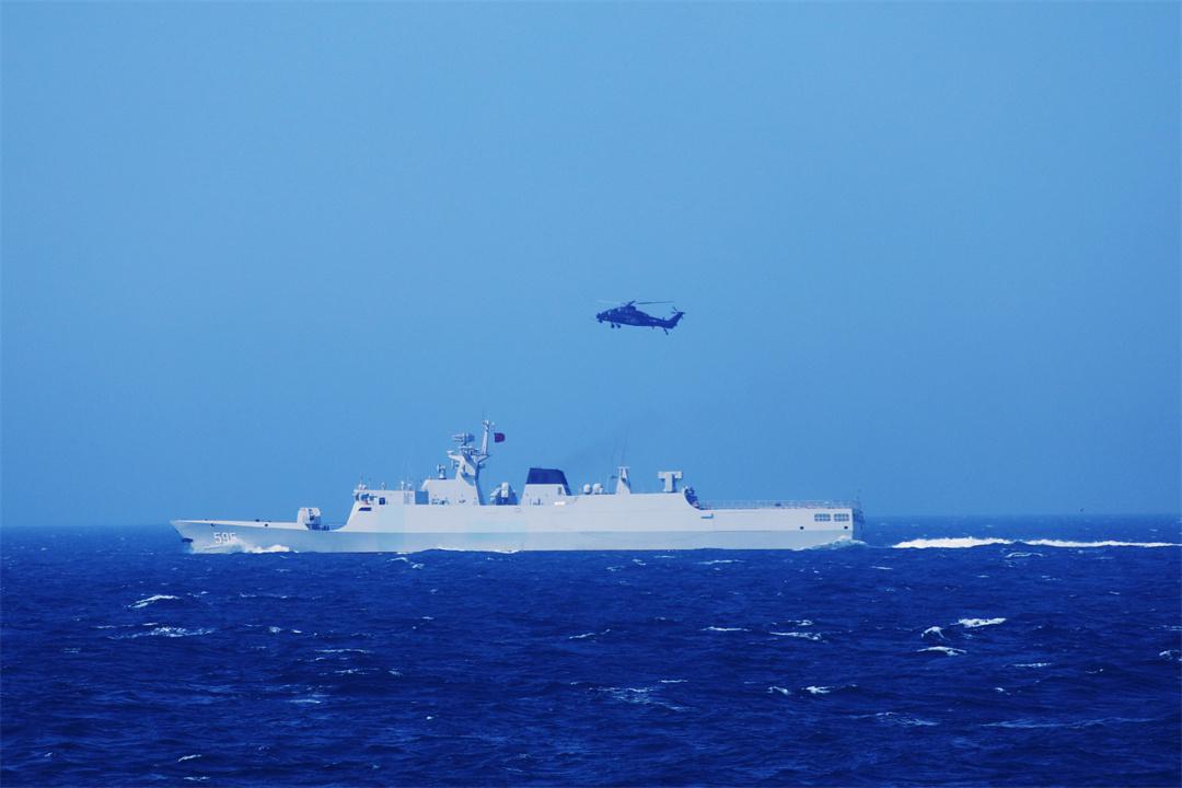 圖為海軍紅河艦在聯(lián)合演習(xí)組織艦機(jī)協(xié)同訓(xùn)練。程建明 攝