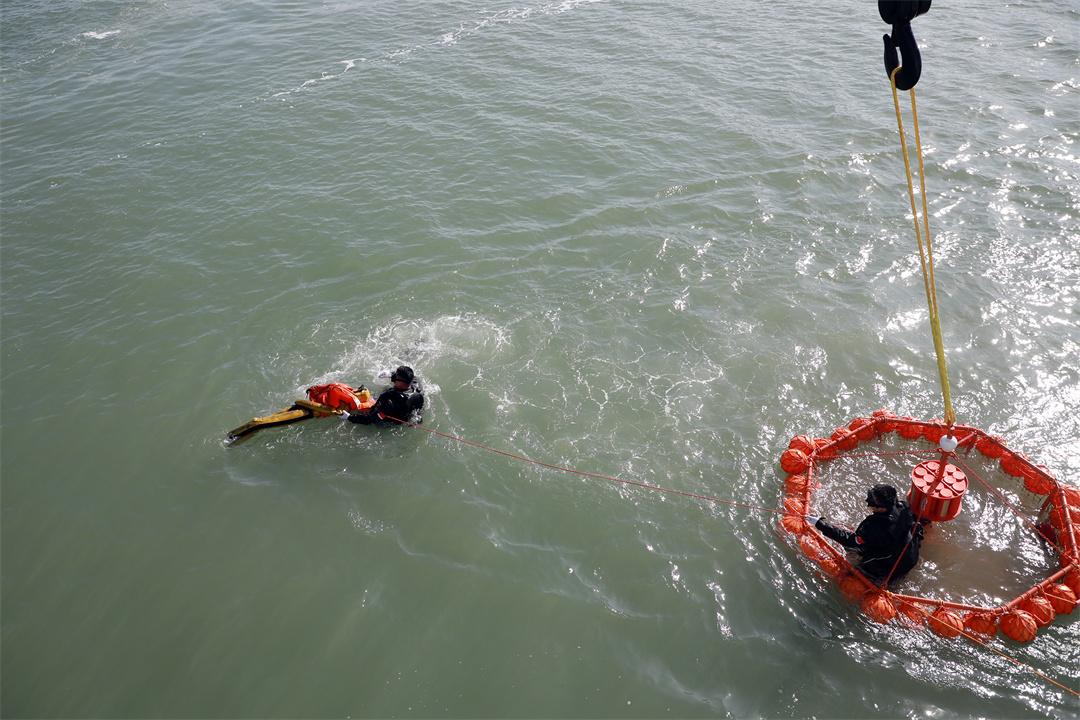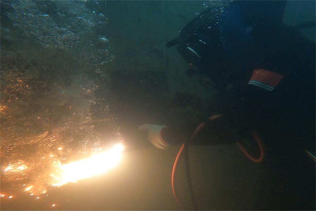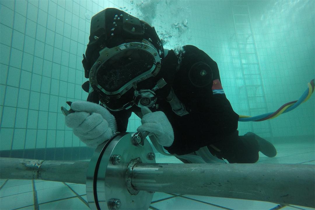 圖為中隊潛水員水下連接法蘭。張濱 攝